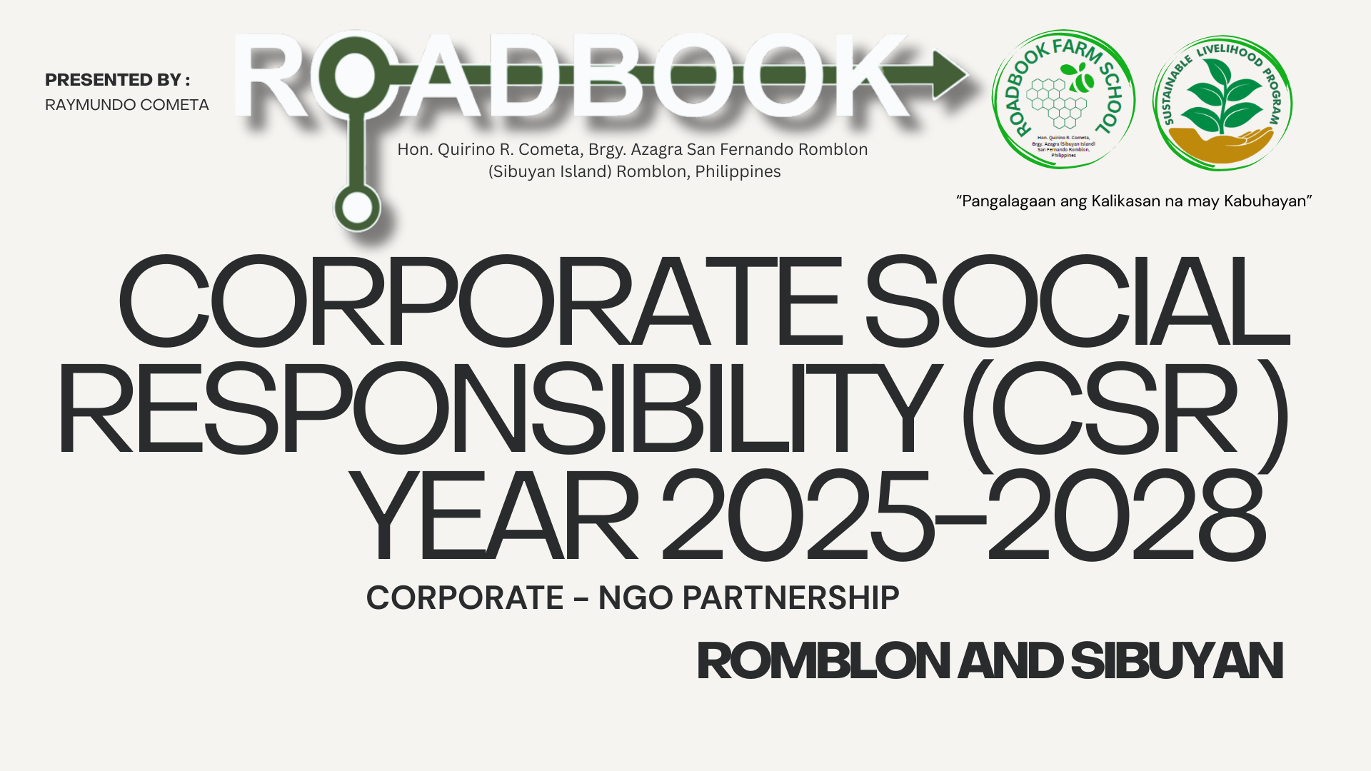 ROADBOOK CENTRE INC. (ROADBOOK for brevity) is a non-stock corporation committed to Corporate Social Responsibility (CSR) and is duly registered with the Securities and Exchange Commission (SEC) since March 13, 2013. It is the first non-government organization (NGO) and civil society organization (CSO) in the province of Romblon that has been recognized and registered by the DSWD as a Licensed Auxiliary SWADA Resource Agency. ROADBOOK is currently engaged in Seaport Operation located at Azagra Port (Municipality of San Fernando Romblon, Sibuyan Island) known as Punta Cauit adjacent to the inherited lands of the Cometa Family being managed by ROADBOOK that facilitate and provide employment to Indigenous Peoples (IPs) communities and volunteers.