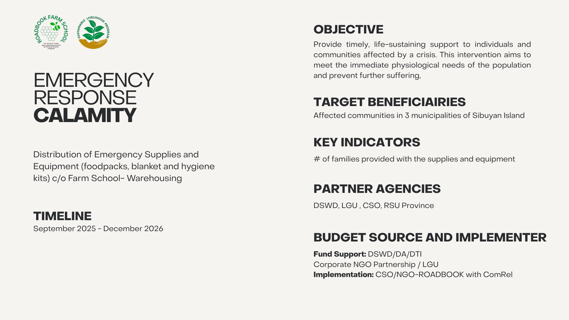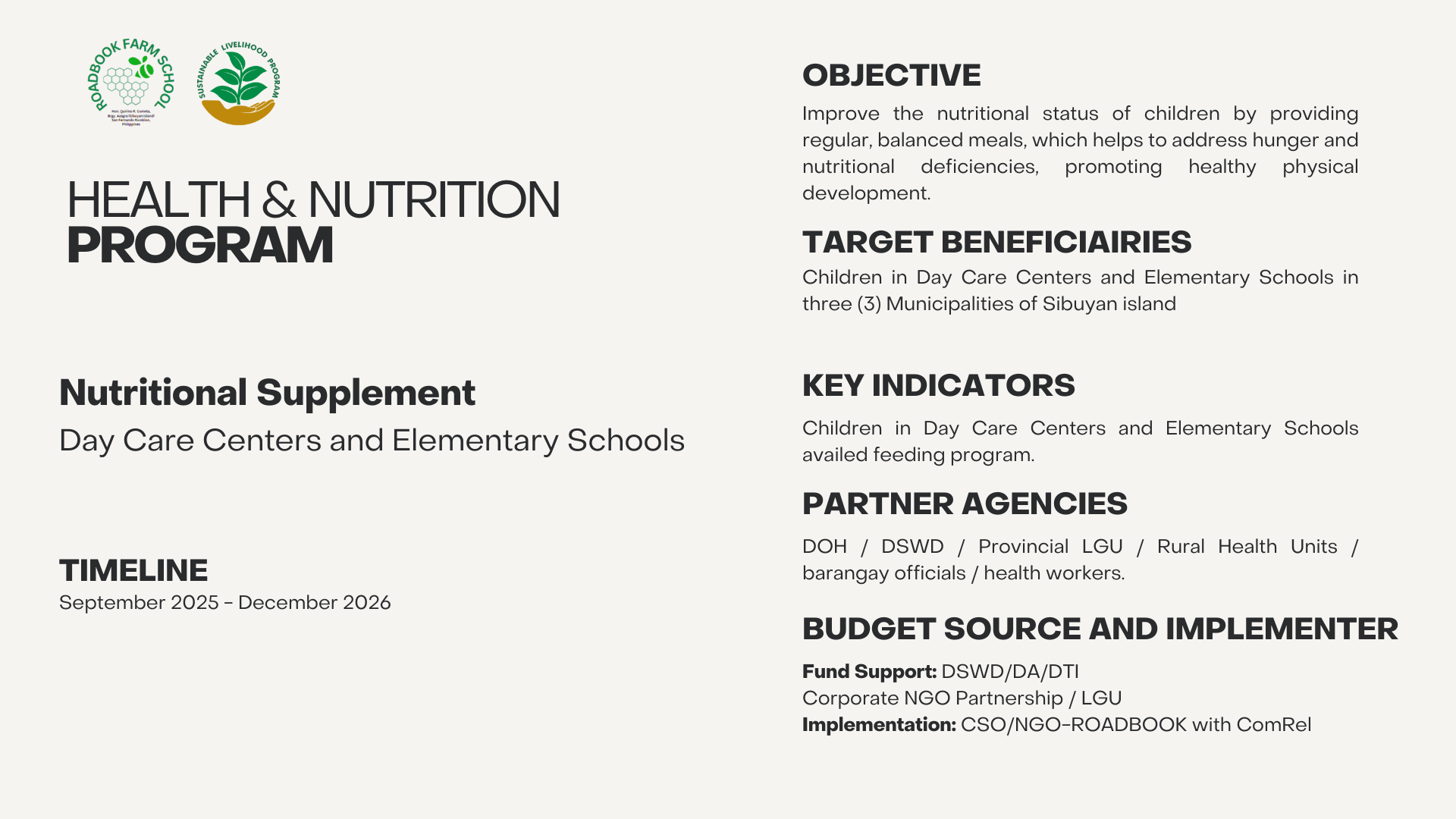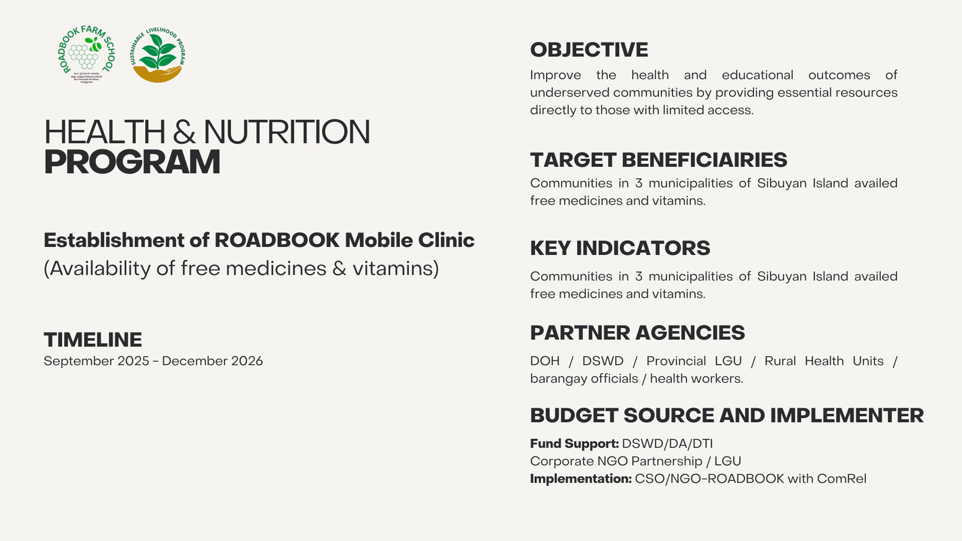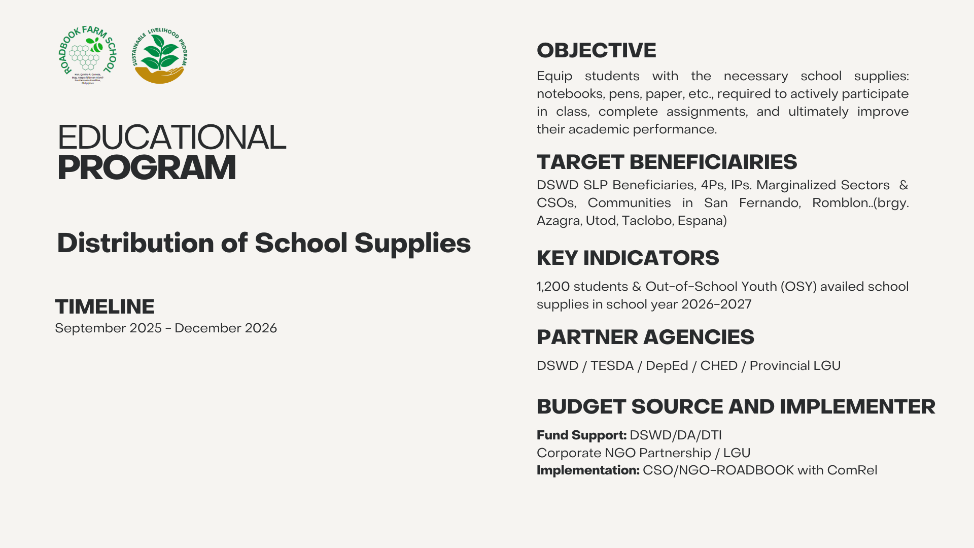 ROADBOOK aims to address the present poverty threshold and economic situation of the province where the inhabitants are mostly poor and potential areas for development are progressing slowly. Thus ROADBOOK programs are in support to poverty alleviation and economic development in the areas where ROADBOOK is present.