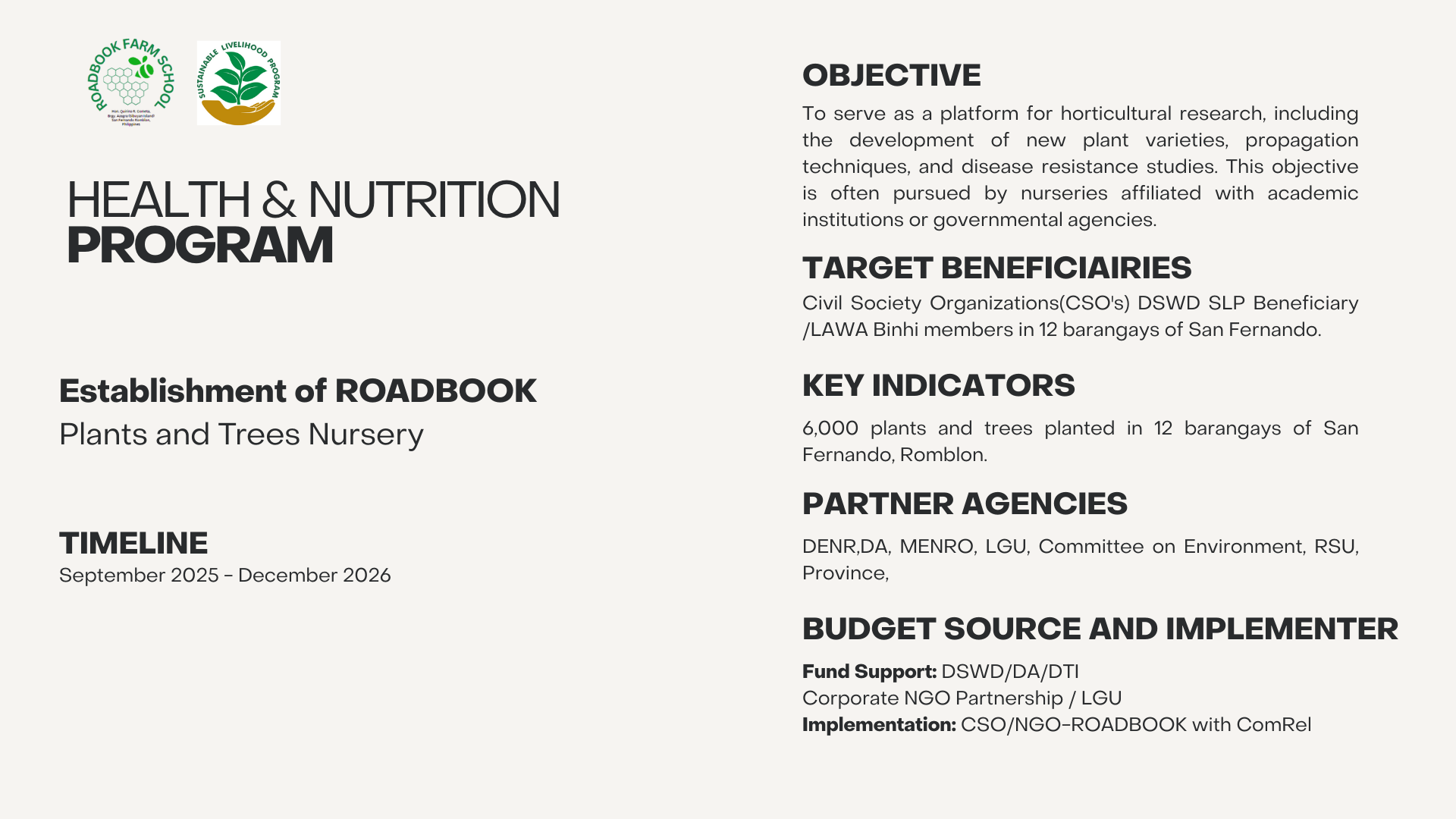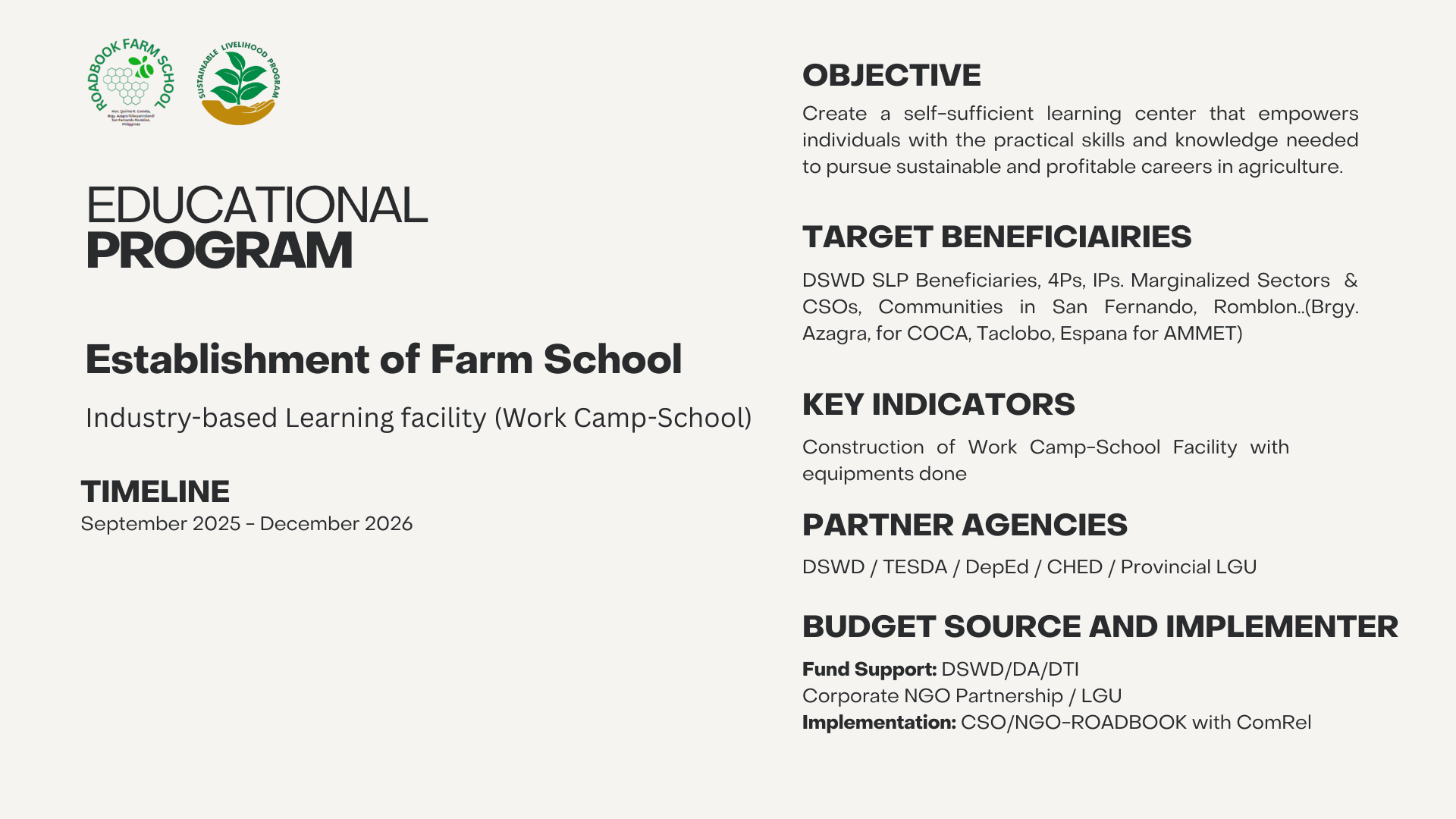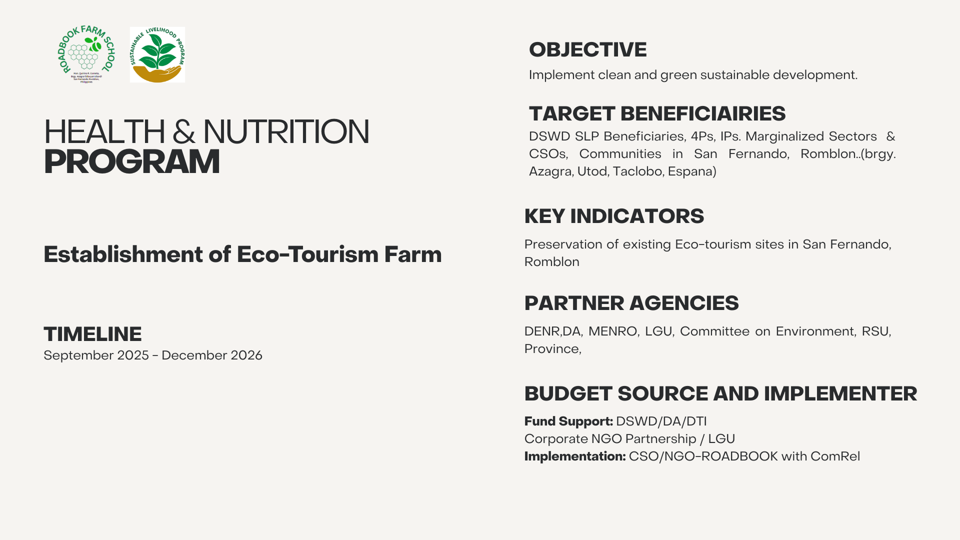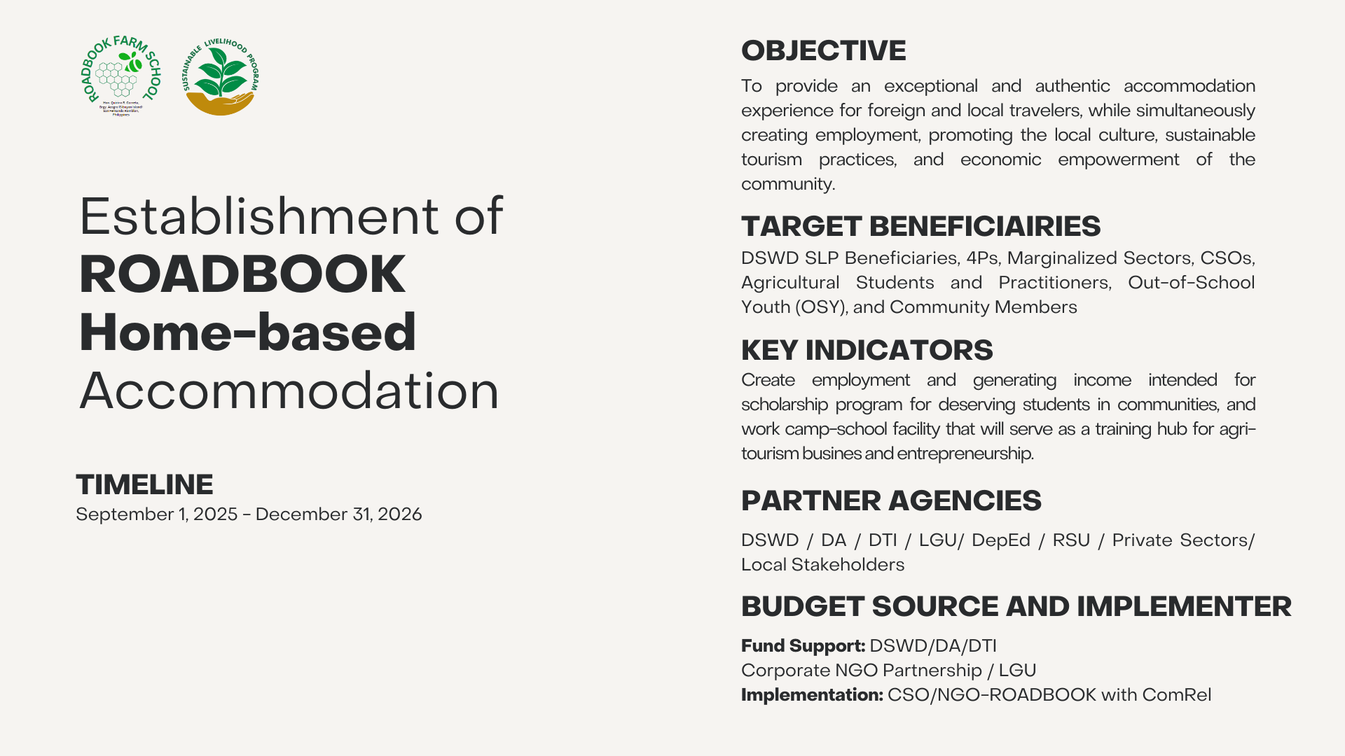 In order to maintain and sustain its CSR, ROADBOOK managed inherited lands that are converted into Farm School/Farm Tourism in line with the Republic Act (RA) 10816, otherwise known as the Farm Tourism Development Act of 2016 and with RA 7686 known as the Dual Training System (DTS) Act of 1994 that is being administered by TESDA. These laws encourage farmers or owners to convert their properties into Tourist Farm destination and at the same time serve as a learning place that will generate income from the crops or harvests of the farm. The guests /tourists/trainees who will visit and stay for camping/industry learning will plant any kind of agricultural seeds/seedlings, while prospective community volunteers will focus on Agriculture and Clean Green Sustainable Environment.