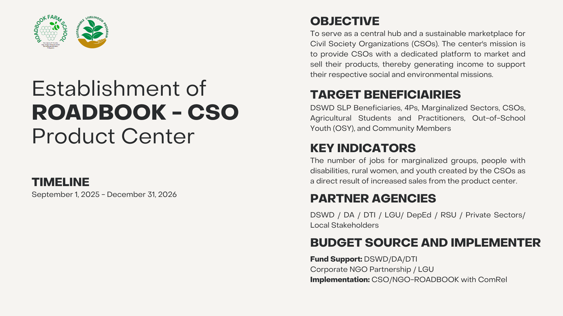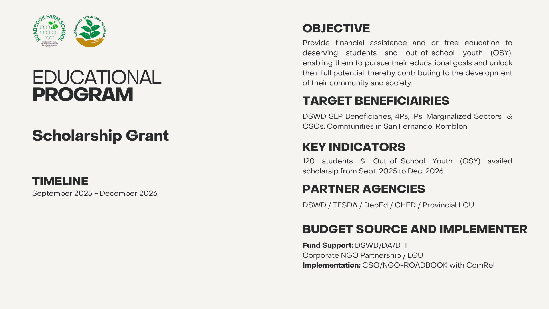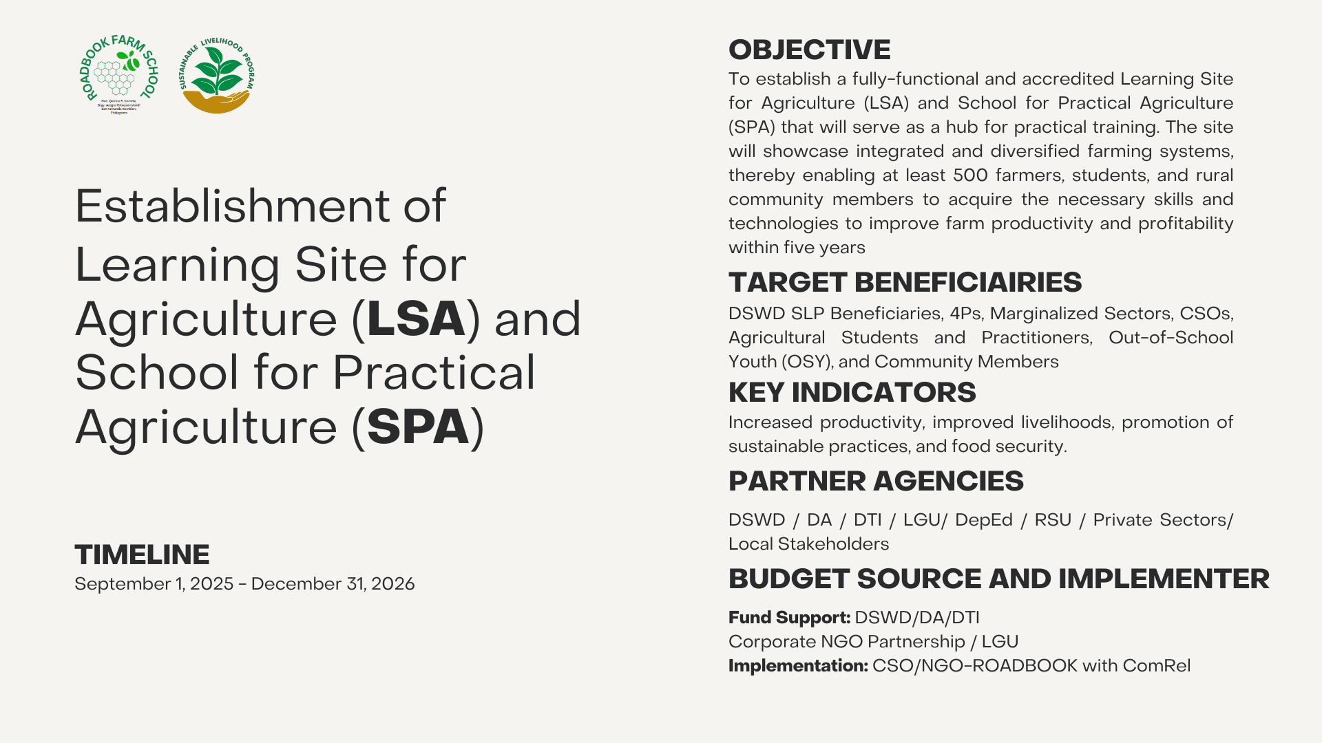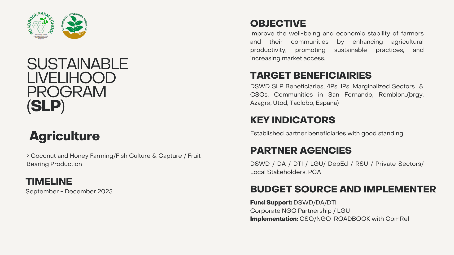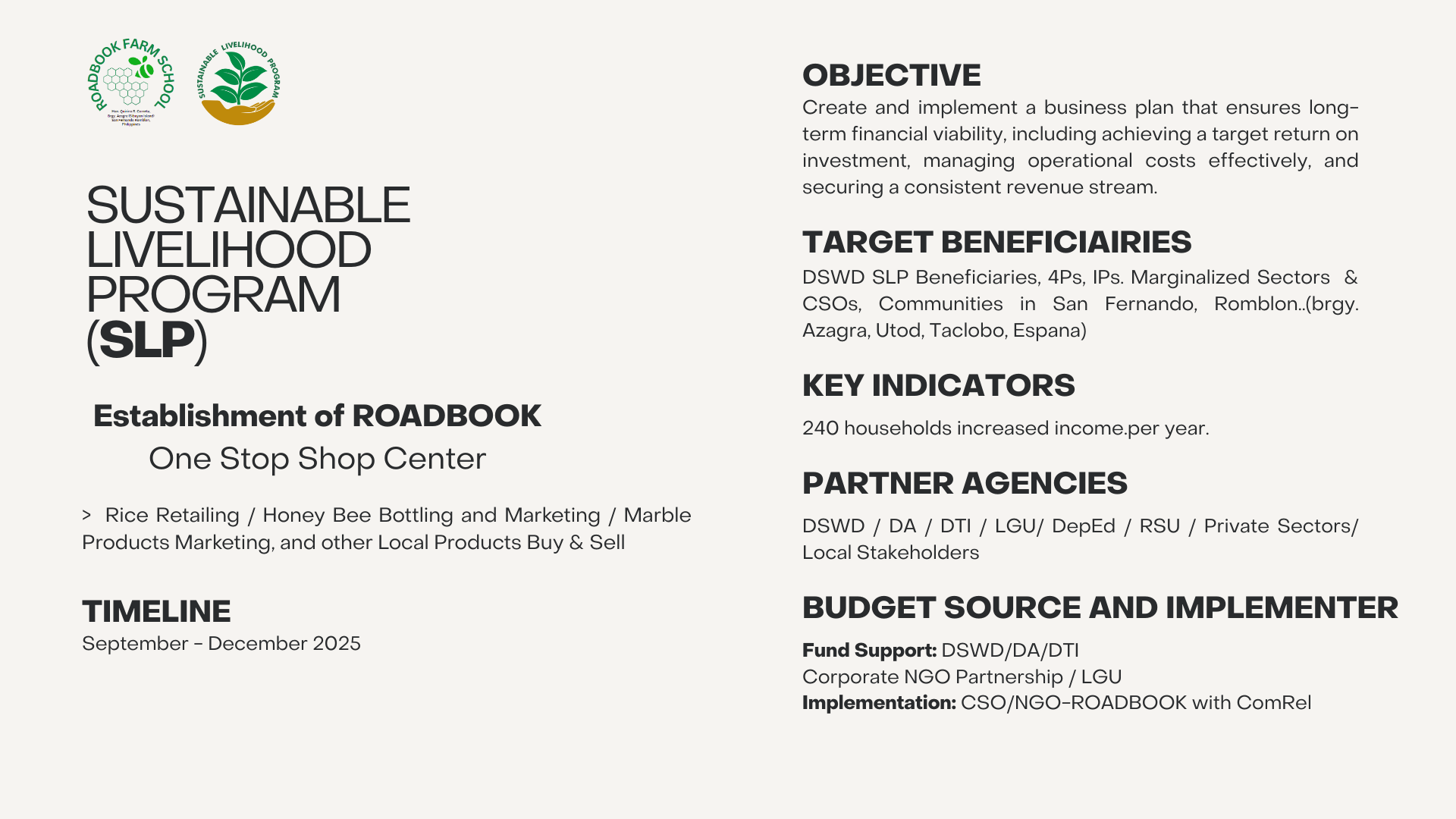 To contribute in achieving the objective of the sustainable livelihood program (SLP) and attaining the administration’s ten-point socio-economic agenda and development goals as articulated in the Philippine Development Plan,